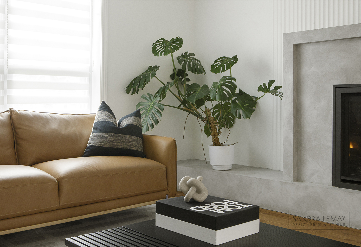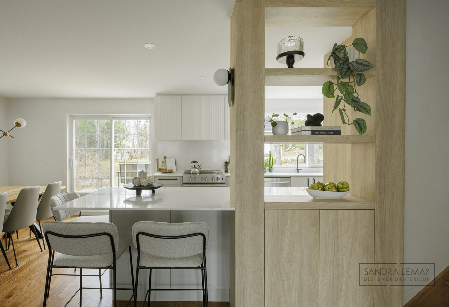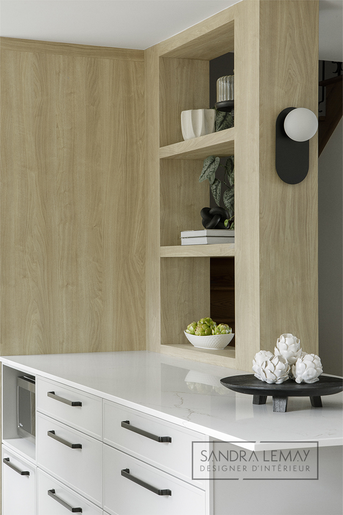 Et rien de mieux qu’un rangement façon bibliothèque pour camoufler une colonne sans nuire au design intérieur. Non seulement il forme un bel espace pour exposer des objets décoratifs et des végétaux qui embellissent les lieux, mais il permet également de rappeler les tonalités et textures présentes ici et là dans l’espace de vie. En fait, la cuisine offre tellement de rangement que nos clients ne l’avaient même pas entièrement rempli lors de notre visite!