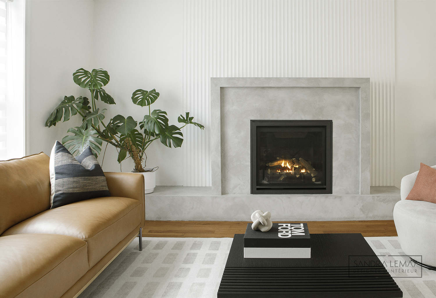 Du manteau de foyer avec peinture à la chaux, en passant par les armoires texturées de cuisine jusqu’au détail de l’arche dans le hall d’entrée, absolument tout a été réfléchi pour mettre en valeur les tonalités et les textures phares du projet avec raffinement. Bois franc, lambris, cuir, comptoirs en quartz clair, dosseret effet marbre et couleurs douces s’entremêlent pour inviter au calme et à la reconnexion.
