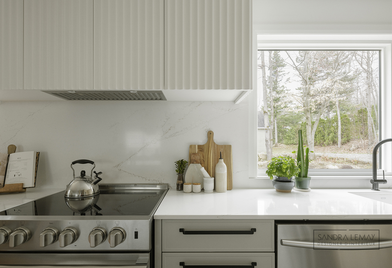 Le jeu de textures des lattes 3D de couleur blanc crème apporte du dynamisme, en insufflant un rythme régulier et apaisant d’une pièce à l’autre. Cet élément signature confère une cohérence à l’ensemble de l’espace pour un résultat harmonieux. Mention spéciale à notre ébéniste de confiance, qui a su développer le module de la hotte de la cuisinière avec une belle finesse, expressément pour nos clients.